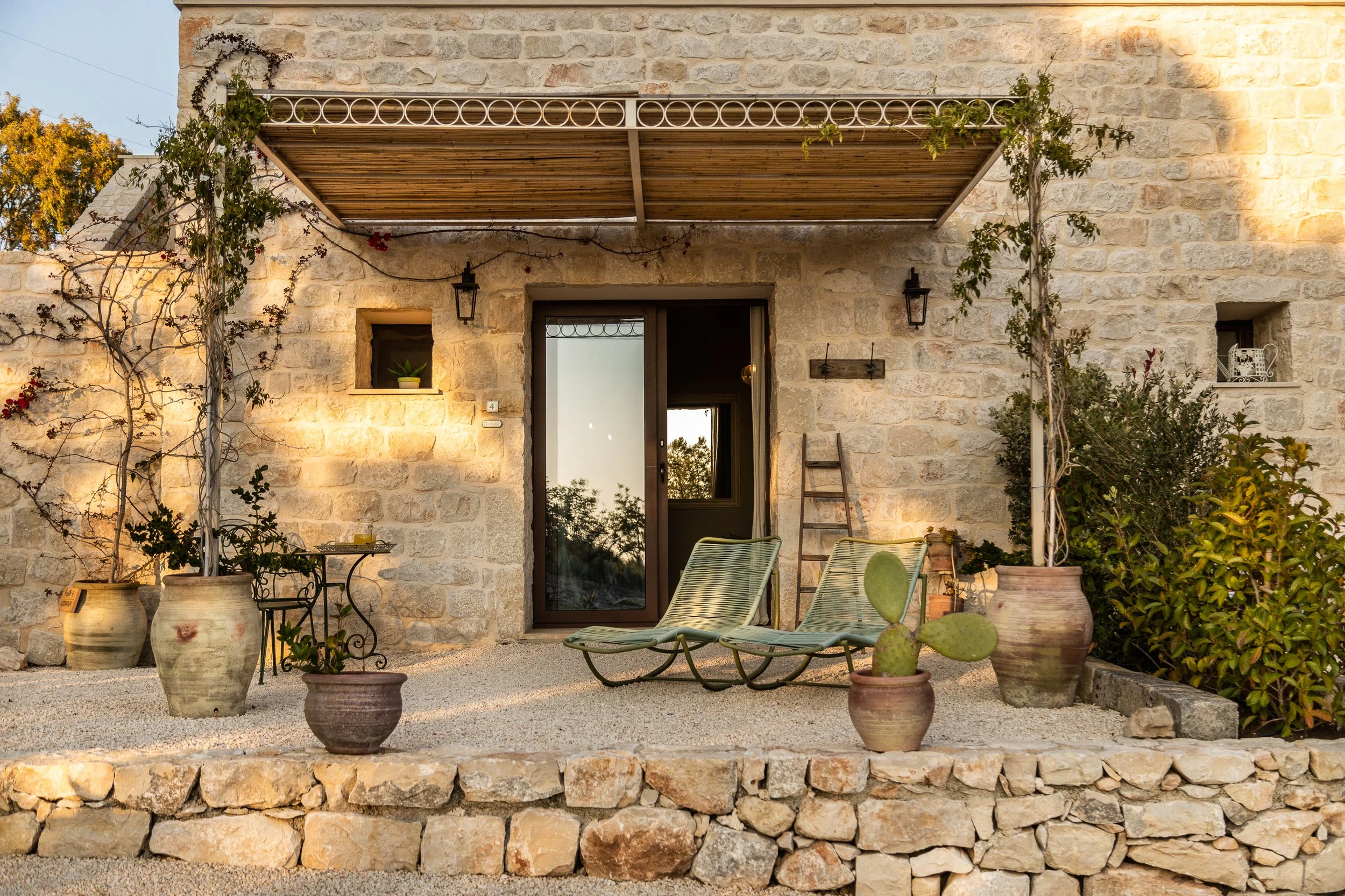 The main house, built from soft local stone, carries an ancient beauty and a deep connection to the land. Each room is unique, full of character and atmosphere, and opens onto its own patio or garden. The spaces feel both rural and refined, blending traditional Mediterranean charm with thoughtful, modern design.